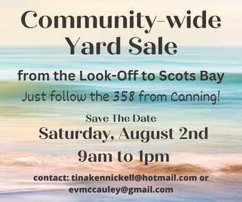 There will be a community-wide yard sale from the Look Off to Scots Bay. Just follow Highway 358 from Canning.