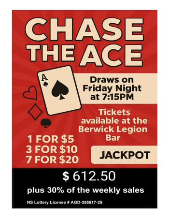 ALL (19+) ARE WELCOME TO PLAY CHASE THE ACE EACH FRIDAY NIGHT. You do not need to be a Legion Member to purchase tickets.