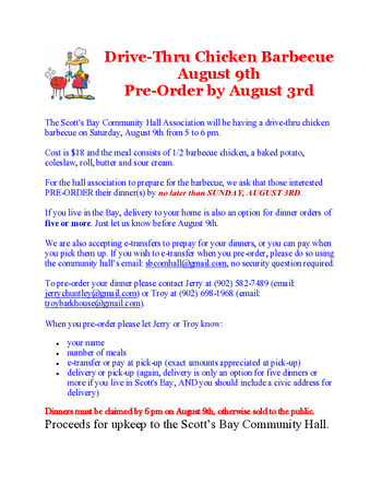 Scott's Bay Community Hall Association will be holding a drive thru chicken barbecue. Dinner consists of 1/2 BBQ chicken, baked potato, roll, coleslaw, sour cream and butter.