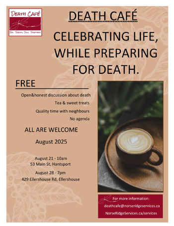 Celebrating life while preparing for death. All are welcome to join in an open & honest discussion about death. Or just come to listen. Coffee, tea & sweet treats provided.