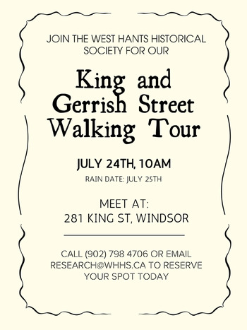 Join the West Hants Historical Society as we walk around King and Gerrish Street and enjoy the views AND the information with our tour guides! Learn about the history of the town with us!
