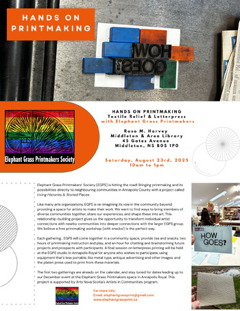 Each gathering , EGPS will come together in a community space, provide tea and snacks, two hours of printmaking instruction and play, and an hour for chatting and brainstorming future projects and prospects with participants. A final session on letterpress printing will be held at the EGPS studio in Annapolis Royal for anyone who wishes to participate, using equipment that's less portable, like metal type, antique advertising and other images, and the platen press used to print from these materials.