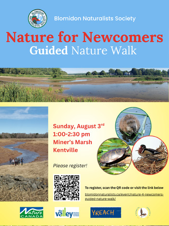 Are you new to Nova Scotia or Canada and would you like to explore one of our beloved nature sites? John Burka from the Blomidon Naturalists Society will lead us on a tour of Miner's Marsh where we will see many species of birds, native plants, and maybe even spot a muskrat!