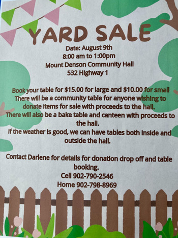 Fundraiser Yard Sale for Mount Denson Community Hall. Tables available to rent $15 large or $10 small with community table for donations and bake table.