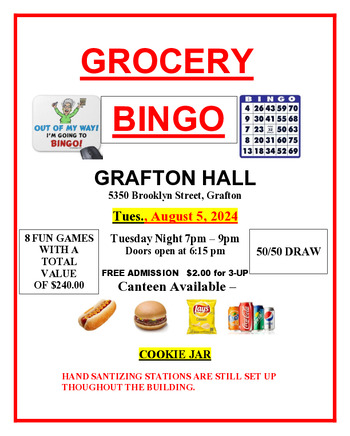 7 games of grocery bingo, each bag valued at $25 with the jackpot bag valued at $50. A 50/50 ticket draw. A special game played for a $30 gift card. Cookie Jar is growing. Full canteen with BBQ hamburgers and hotdogs.