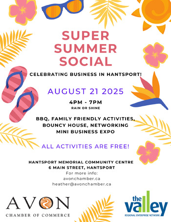 This year our Summer Social Spotlight is focused on...Hantsport! Come out for a fun, family-friendly networking event with lots of free activities for the kiddos, bouncy house, a BBQ in support of Hantsport School Breakfast Program and Hantsport Food Bank, and a mini-expo showcasing Hantsport area businesses.