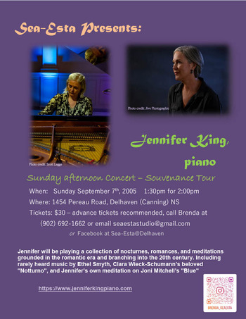 Jennifer King’s latest solo piano album Souvenance is a collection of nocturnes, romances, and meditations grounded in the romantic era and branching into the 20th century. Including rarely heard music by Ethel Smyth, Clara Wieck-Schumann’s beloved "Notturno", and Jennifer’s own meditation on Joni Mitchell’s "Blue". This recital, and album, is an introspective journey rich with heartbreak, hope, strength, and tenderness. Recorded in Jennifer’s living room, Souvenance invites the listener to sit on the piano bench beside her for a deeply personal experience of the music. Souvenance’s composers are all women, most of whom faced formidable gender-based barriers to having their voices heard. Souvenance was named Record of the Week on CBC’s In Concert and is playlisted on Apple Music’s Pure Piano.