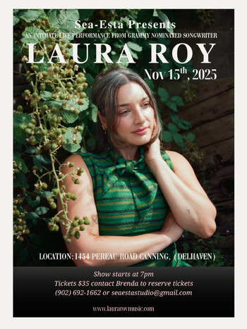 Laura Roy is a Canadian artist, musician, and Grammy-nominated songwriter originally from Canning, Nova Scotia. Her music blends soulful melodies and introspective songwriting with contemporary folk influences. A graduate of the NSCC Music Arts program, Laura spent years honing her songwriting craft through writing camps across the country with the Songwriters Association of Canada and as a returning participant in the prestigious Gordie Sampson Songwriting Camp. Since relocating to London, UK in 2017 to further her musical career, Laura has built an impressive international profile. She has toured globally as a backing vocalist for major acts and collaborated with artists such as Sabrina Carpenter (Wembley Stadium and BBC Live Lounge), JP Cooper (World Tour 2024), and Dua Lipa. Now a 2x ECMA Award-winning artist, Laura recently returned home to Nova Scotia to record new music, bringing with her a wealth of experience and a fresh creative perspective. With her soulful sound and impactful storytelling, she continues to establish herself as a standout voice in contemporary music.