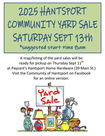 Hantsport's annual community yard sale! Everyone welcome to come by and buy! Suggested start time is 8am and most sales wind down around noon. A map will be ready for pick up at Payzant's Home Hardware (39 Main St) on Thursday September 11th and online on the Community of Hantsport's FaceBook page.