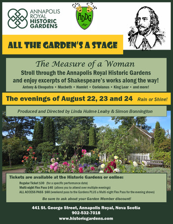 We are pleased to welcome the Annapolis District Drama Group for three great evenings of Shakespeare in the Gardens. You will tour the beautiful Annapolis Royal Historic Gardens in the evening light and encounter tastes of Shakespeare along the way. (Antony & Cleopatra – Macbeth – Hamlet – Coriolanus – King Lear – & more)