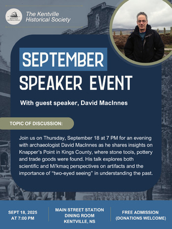 Kentville Historical Society hosts Speaker, David MacInnes, talking about his research on the Mi'kmaq who lived along the Gaspereau River at one time. All welcome!