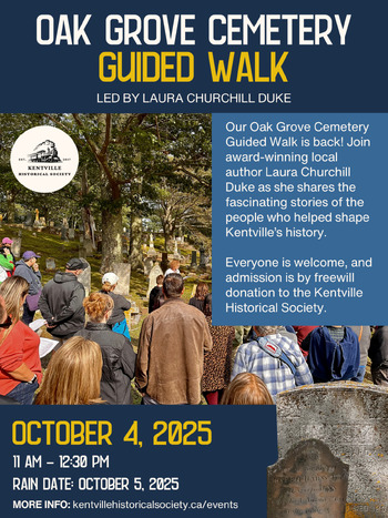 Guided walk led by Laura Churchill Duke sponsored by Kentville Historical Society. Rain date Sun., Oct. 5. Start at entrance; sturdy footwear encouraged. Parking across the road, near Burgher Hill.