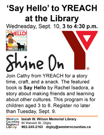 Join Cathy from YREACH for a story time, craft, and a snack. The featured book is Say Hello by Rachel Isadora, a story about making friends and learning about other cultures. This program is for children aged 3 to 8. Register no later than Tuesday, Sept. 9 by contacting the library. Walk-ins are welcome.
