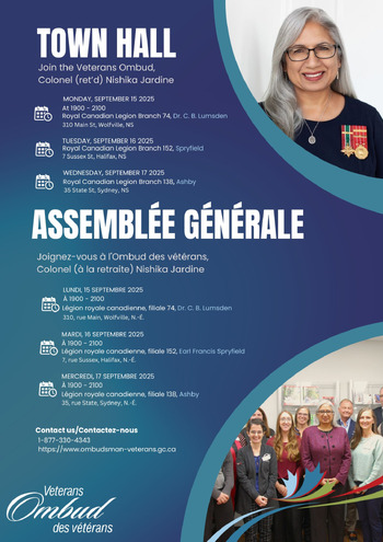 Upcoming Town Hall Meetings with your Veteran Ombud, Colonel (Ret'd) Nishika Jardine, in September in Nova Scotia!