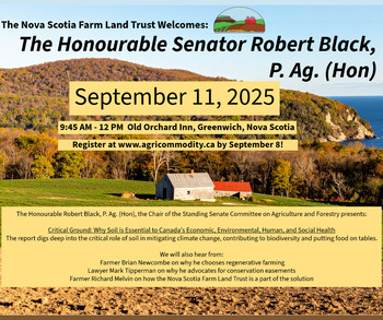 This is a free event sponsored by the Nova Scotia Farmland Trust Society with support from the Municipality of Kings and others. In addition to Senator Black, other speakers will address soils and conservation of farmland. Please register by September 8th at www.agricommodity.ca. PLEASE DO NOT CONTACT THE OLD ORCHARD INN TO REGISTER.