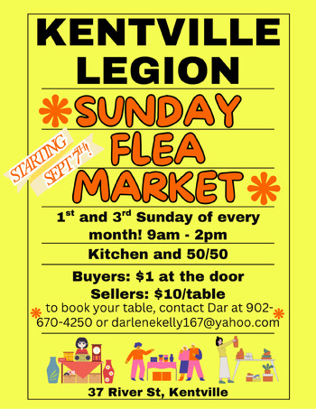 Kentville Legion will have a Flea Market every 1st and 3rd Sunday of the month. To book your table, contact Dar by calling/texting 902-670-4250 or email [email protected].