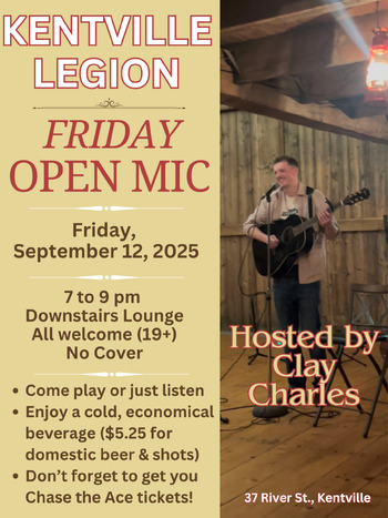 Friday night's Open Mic hosted by Clay Charles is back! Clay will host Open Mic every 2nd Friday (except Sept 26th during Legion Week. He will sing at the Patio Party instead on Saturday, Sept 27th)
