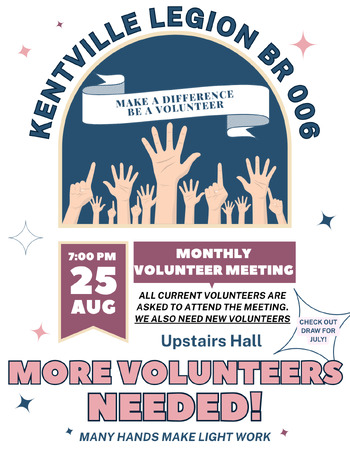 Make a difference. Feel good about it. Help keep events and the Kentville Legion going. How? Be a Volunteer! You don't even have to be a Legion Member to be a Volunteer!