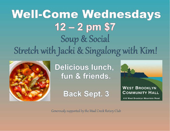 Well-Come Wednesdays feature hot lunch (soup & bun); gentle chair exercise; and music. If you are 55+ or would just like to participate, drop in and join the fun!