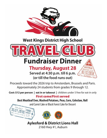 Monthly Supper with Funds going to "West Kings District High School - Travel Club" to help pay for their trip in 2026.