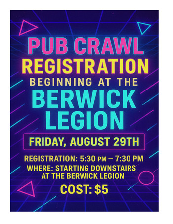 Here is some information regarding the Berwick Gala Days Pub Crawl that begins with registration at the Berwick Legion.