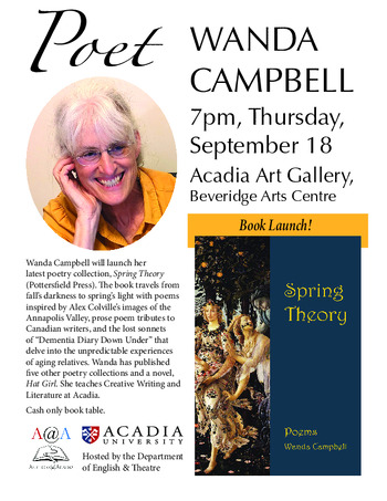 Author Wanda Campbell will launch her latest poetry collection, Spring Theory. The book travels from fall to spring with poems inspired by Alex Colville’s images of the Annapolis Valley, prose poem tributes to Canadian writers, and sonnets that delve into the unpredictable experiences of aging relatives.