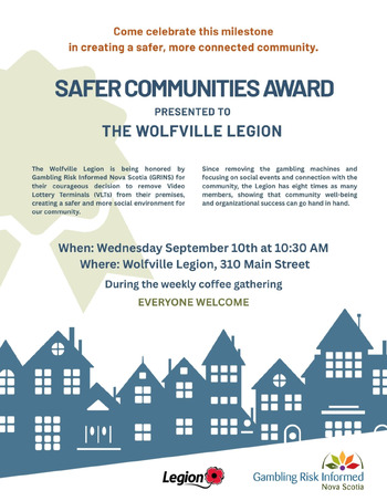 The Wolfville Legion is being honored by Gambling Risk Informed Nova Scotia (GRINS) with presentation of a plaque to acknowledge their courageous decision to remove Video Lottery Terminals (VLTs) from their premises, creating a safer and more social environment for our community.
