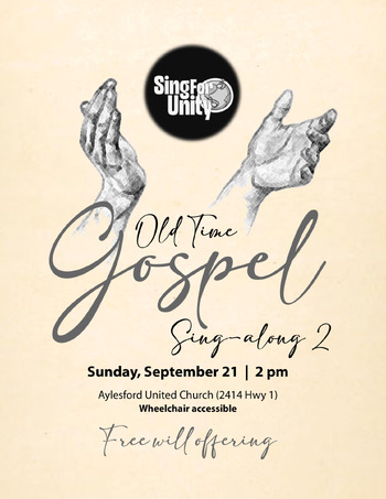 This event is part of the United Nations International Day for Peace on September 21st. “Sing for Unity” is a global effort singing for world peace, community, and unity at 2 pm local time. Our Old Time Gospel Sing-a-long is part of this Sound Wave of music traveling from time zone to time zone getting stronger as it circles the globe.