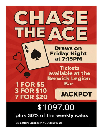 ALL (19+) ARE WELCOME TO PLAY CHASE THE ACE EACH FRIDAY NIGHT. You do not need to be a Legion Member to purchase tickets.