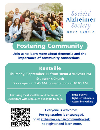 The Alzheimer Society of Nova Scotia will host a public event to learn more about dementia and the importance of community connections. Learn from guest speakers and browse tables from local community organizations. All are welcome! Pre-registration is encouraged.