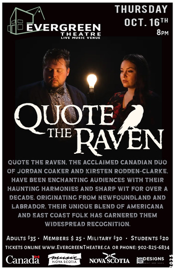 Quote the Raven, the acclaimed Canadian duo of Jordan Coaker and Kirsten Rodden-Clarke, has been enchanting audiences with its haunting harmonies and sharp wit for over a decade. Originating from Newfoundland and Labrador, its unique blend of Americana and East Coast folk has garnered it widespread recognition.