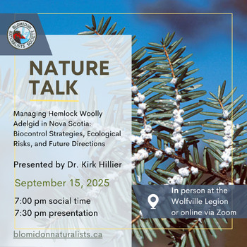 Join in person at the Wolfville Legion at 7:00 pm and enjoy some social time (nature talk starts at 7:30 pm) or join through Zoom: https://us02web.zoom.us/j/85420349316
