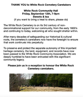 This is a reception to honour & thank the caretakers of the White Rock Cemetery, as they pass that legacy on to the White Rock Community Association, in order to preserve, in perpetuity, the historic roots of this important community cemetery, which had its beginnings in the early 1800s.