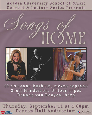 "Songs of Home" - a recital featuring faculty members Dr. Christianne Rushton (mezzo soprano) and Dr. Deanne van Rooyen (harp) with Scott Henderson (Uillean pipes).