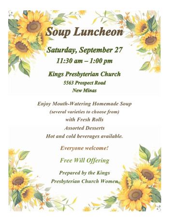 Soup Luncheon. A variety of homemade soups and assorted desserts. Everyone welcome. Free Will Offering.