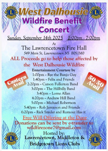 Lawrencetown, Middleton and Bridgetown Lions Clubs hosting a Benefit Concert for the West Dalhousie Community, to help rebuild their community. Canteen available, 50/50 draw and a Free Will Offering at the door.