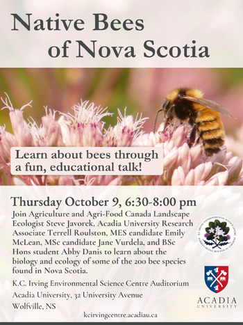 Join Agriculture and Agri-Food Canada Landscape Ecologist Steve Javorek, Acadia University Research Associate Terrell Roulston, MES candidate Emily McLean, MSc candidate Jane Vurdela, and BSc Hons student Abby Danis to learn about the biology and ecology of some of the 200 bee species found in Nova Scotia.