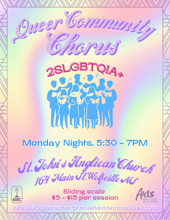 The Wolfville Queer Community Choir is a multi-generational group of singers from the 2SLGBTQ+ community who gather each week to make music and connect with one another. We are always happy to welcome new members and encourage folks with any singing experience and all ages to join. This choir is a queer space. Please contact Music In Communities with questions: [email protected]