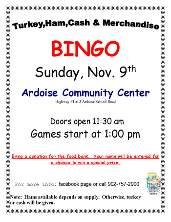 Turkey, Ham, Merchandise, and Cash Bingo. Canteen open. Hams are based on supply - otherwise turkey or cash will be given. 50/50 draw. Bring a non-perishable item for the food bank and receive a ballot for one of several prizes.