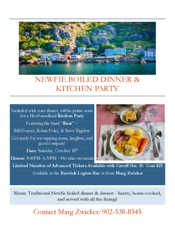 Where to buy Tickets: Available at the Berwick Legion Bar or from Marg Zwicker (902-538-8545)