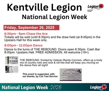 All welcome (19+) to the Legion Week FREE Friday Night Dance with entertainement provided by Slightly Slanted. This event is generously supported by CJs Taxi Service.