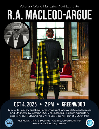 Vetreans World Magazine Poet Laureate, R.A. MacLeod-Argue, will be presenting poetry and passages from his book "Halfway Between Success and Madness." Meet the author and participate in a community talk about military experiences and PTSD.