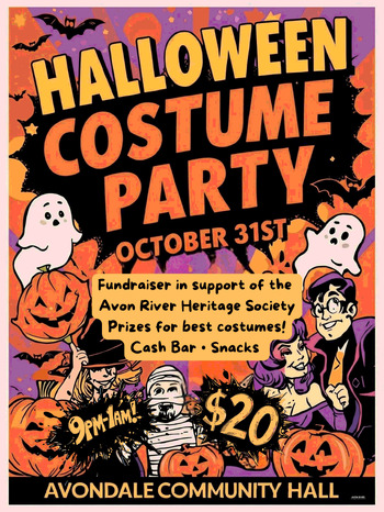 Get ready for a night of thrills, chills, and community spirit! Join us for a Halloween Costume Party like no other, hosted in support of the Avon River Heritage Society. Your ticket to the event will help raise vital funds for the Avon River Heritage and Culture Centre, ensuring that we can continue to bring exciting and enriching programming to our community. Prizes for best costume! Order your tickets in advance by contacting [email protected]