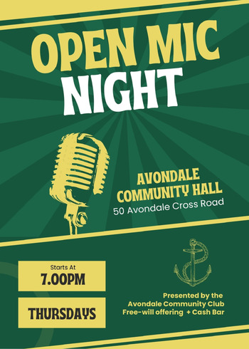 Open Mic hosted by the Avondale Community Club. Free-will offering. Sign-up starts at 7pm.