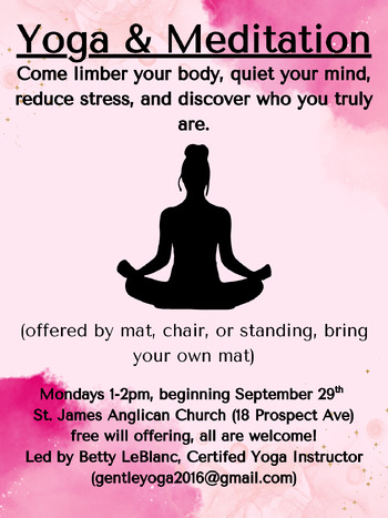 Come limber your body, quiet your mind, reduce stress & discover who you truly are. By mat, chair or standing (bring own mat). All welcome. Freewill offering.