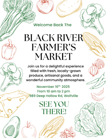 Welcome back, the Black River and District Community Hall Farmer's Market. We will have vendors from both within and outside the community. 4H will be selling raffle tickets for a quilt. There will be baked goods, crafts, jewelry, preserves and many more. Admission is a freewill donation at the door; we will have a canteen open to sell drinks and hot dogs.