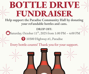 We're collecting refundable bottles and cans to help raise funds for our community hall.