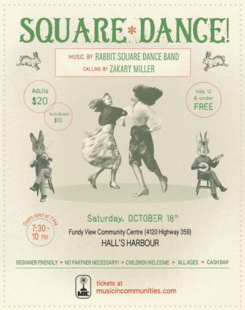 The Rabbit Square Dance Band goes to Hall's Harbour for a dance, with Zakary Miller calling. Come one come all, learn the moves and dance with your friends and family! All ages welcome.