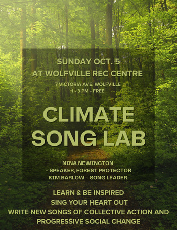 Sunday, October 5, Nina Newington will speak about her experiences in forest protection in Nova Scotia. Then Kim Barlow will lead some songs, with lyrics projected so we can sing some good songs that are earthy and heartening. Singing feels good and is a great release of tension. Then we can write some ideas down and maybe sing some more. Instrumentalists welcome. Bring your guitars, ukes, fiddles. We would love to see some brass instruments! This will be the first of many sessions and over time we hope the group will make some songs together and separately, and learn to play them, and take them to the streets.