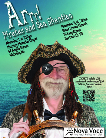 Arrr! Matey! Come enjoy a rollicking evening of Pirates Songs and Sea Shanties presented by Nova Voce, Nova Scotia's provincial men's choir! You'll hear lots of familiar songs, original compositions and arrangements of pieces by Nova Scotia composers, and much more!